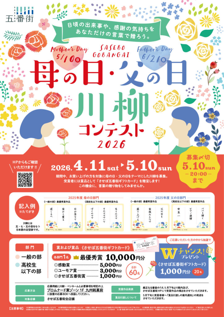 期間中、お買上げの方を対象に母の日・父の日をテーマにした川柳を募集。受賞者には賞品として「させぼ五番街ギフトカード」を進呈します!