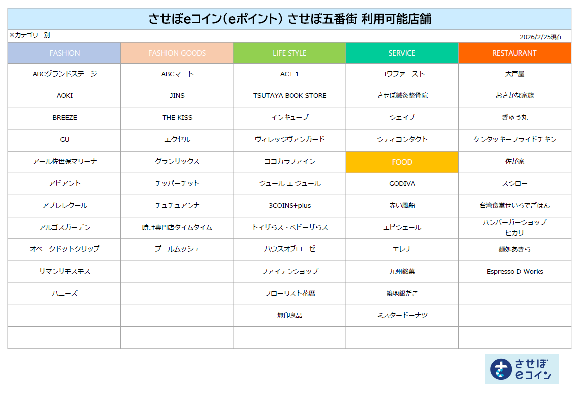 News 2026.02.25 「させぼeコイン」利用可能店舗のご案内 ★佐世保市の地域通貨「させぼeコイン」★ させぼ五番街での利用可能店舗は下記の通りとなります。 させぼeコインについて、ポイント有効期限などの詳しい情報につきましては下記のページをご確認ください。 地域通貨「させぼeコイン」発行事業