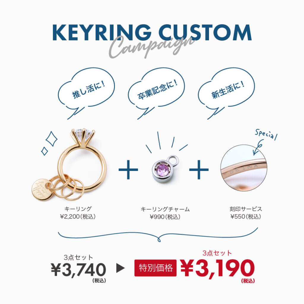 キーリング(¥2,200)+ 刻印(¥550)+ チャーム(¥990)の3点セットが、通常¥3,740(税込) → 特別価格 ¥3,190(税込)で購入可能!