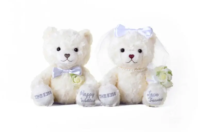 オリジナルベア「LOVE」と「HAPPY」がブライダルコスチュームに身を包み、お揃いのブーケとブートニアで仲良くコーディネート。