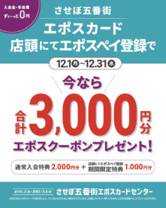 店頭にてエポスペイ登録でご入会をしていただくと、通常2,000円分のエポスクーポン券が期間限定で3,000円分となります!