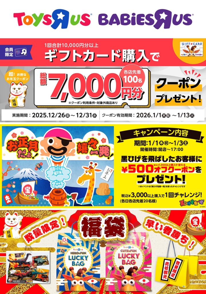 1/1のSALEに先駆けてトイザらス・ベビーザらスギフトカードを 1回¥10,000円以上購入で総額¥7,000分のクーポンをプレゼントしております。