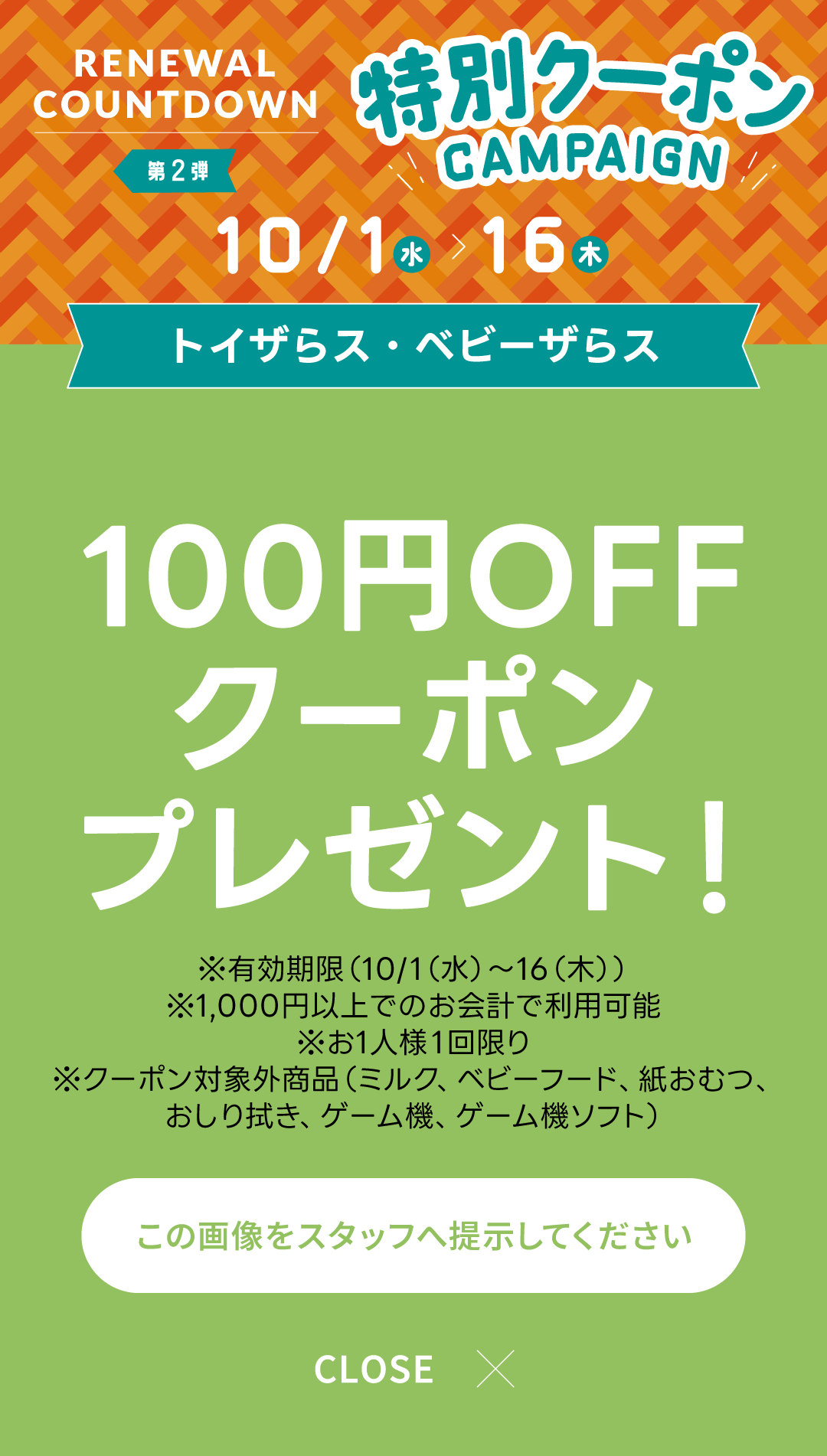 - クーポン対象外商品(ミルク、ベビーフード、紙おむつ、おしりふき、ゲーム機ソフト)